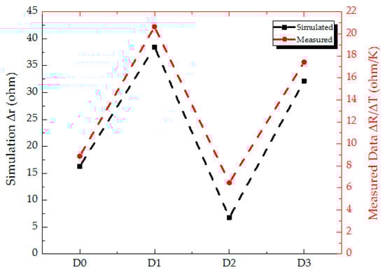 ΔR/ΔT measured shown in Table 5 has high-order positive relation to Δr converted from ΔT taken with 3D thermal modeling, and its related plot is shown in Figure 7. In this figure, the black and red dashed lines indicate the Δr (simulated) and ΔR/ΔT (measured) extracted from Table 4 and Table 5, respectively. In all of 4 kinds of proposed microbolometer structures, Design 1 has the largest Δr and ΔR/ΔT. It can be explained the thermal capacitance of Design 1 is the smallest contrasted to the other structures and results in lower τ to increase the responsivity of the microbolometer structure referred to Equation (10). On the other side, Design 2 has the smallest Δr and ΔR/ΔT. It is due to the largest thermal conductance of Design 2 with four legs among four kinds of microbolometer structures, which lead to the lowest responsivity. With compared to Design 0 and Design 3, Design 3 increases the spacing from 14.5 (standard) to 20.5 μm between two vanadium contacts for the propose of increasing responsivity and detectivity. From Table 3, the values of responsivity and detectivity of Design 3 are calculated using the analytic equations in Section 2.2 incorporated with the physically geometry structures and the associated material coefficients to approach 1.25 105 V/W and 1.65 109 cm-Hz1/2/W, respectively. The above values of Design 3 have almost two times of Design 0 (standard). The trend is also deduced to cross-prove the credibility by the analytic equations and thermal distributed modeling. It is noted that the modeling proposed with COMSOL Multiphysics Simulator can predict the parametric performance of different kinds of microbolometer structures in advance. Furthermore, the evaluation of device structures associated with optoelectronic parameters is also a very significant for subsequent device processes.