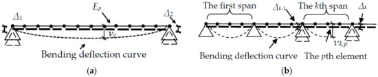 ICBM can be adapted to monitor bending deflection for a multi-span bridge as shown in Figure 1b. For a multi-span bridge, Δk−1 and Δk represent the settlements that have occurred at two supports of the kth span of the bridge. The kth span is equally divided into m elements labelled as Ek,1~Ek,m. The length and the height of the kth span are Lk and hk, respectively. The average strains at the top surface and the bottom surface of the Ek,i are and (1≤ i ≤ m), respectively. Thus, the vertical displacement at the boundary point between Ek,p and Ek,p+1 in the kth span is: