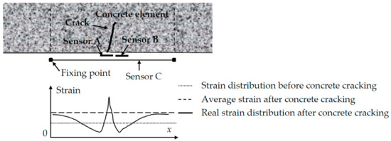 In concrete structures, precise and long-term strain monitoring is quite difficult due to concrete cracking. Figure 2 illustrates the traditional strain measuring by short-gage sensors (Sensor A and Sensor B) that are bonded to the surface of the structure using resin. Before concrete cracking, both sensors measure the true concrete strain. After a crack occurs, Sensor A may be overstretched to the point where it may even break because its gauge covers the crack. The strain measured in Sensor B is almost released fully at the same time. The measurements from such short-gage sensors cannot represent the true strain increasing in this case. Long-gage sensors address the point fixation concern as only the two ends of the sensor are bonded to the specimen to measure the uniform strain distribution in its gauge. Another notable advantage of a long-gage sensor is the fact that the sensor can avoid sudden rupture induced by the concrete cracking because the sensing part of the sensor is not directly fixed to the concrete surface. Therefore, it is found that a long-gage sensor has advantages over the traditional short-gage sensor in the strain monitoring for concrete structures.