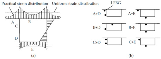 As shown in Figure 4a, the strain distribution on the flange of a box girder is non-uniform due to the action of shear lag effect. The non-uniformity of strain requires a discussion of the strain sensor placement in the box girder. As illustrated in Figure 4b, there are five possible locations from A to E for the placement of LFBG sensors in addition to two additional concerns that affect strain sensor placement. The first one is that fixing the sensor on the outer surface of a box girder is typically more practical than doing so on the inner surface of a box girder. The other one is that the strain distribution around the practical fixing location needs to follow the plane-section assumption to be far from the influence of shear lag. To address these two concerns, the scheme with sensor placements at C + D is likely the most suitable choice for the LFBG sensor placement in practice.
