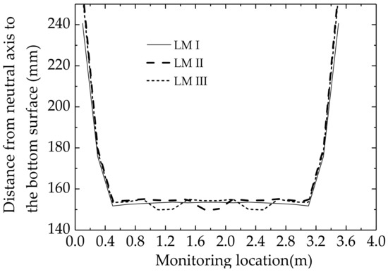 Long-gage strain measurements of 18 elements for the different LMs are given in Table 2. In each element, compressive strain occurs in the upper part, and tensile strain occurs in the lower part. Figure 6 shows the distances between the neutral axis and the bottom surface of each element for three different LMs and where the distance is determined from: