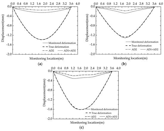 A comparison between the monitored deformations and true deformations under the different LMs are shown in Figure 7a–c. The dashed lines represent the true deformations, and the solid lines are the monitored deformations calculated by substituting strain data in Table 2 into Equation (17) (λ = 1.1). The dot-dashed lines and the dotted lines in Figure 7 are AD2 and the sum of AD1 and AD2, respectively. It is found that AD1 and AD2 may each separately account for about 10% of the total deformation. Thus, the deformation calculated by the original method shown in Equation (1) is only able to represent about 80% of the total deformation. The difference between the two monitored deformations cannot be ignored, and the proportions of AD1 and AD2 also show that they should be considered separately as in the revised model. Most of the deviations between monitored deformations and true deformations are about 0.3–1.5% except those of E9 and E10 in LM II that had a value of 2.4%. In fact, the accurate value of λ under the condition of uniform loading is about 1.069–1.079; this value is close to the assumed constant value of 1.10. The accurate value of λ in E9 and E10 under the condition of concentrated loading is 1.266 and is significantly larger than 1.10. This deviation may be the main reason leading to the error of 2.5% in the calculated deformation of E9 and E10 in LM II.