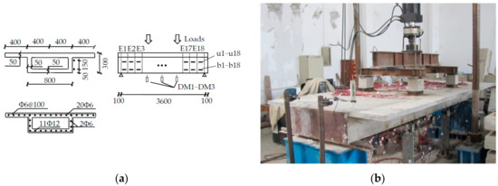 Details of the beam dimensions and reinforcement configuration of the simply-supported single-cell box girder used in the experiment are shown in Figure 8. The dimensions of the section and the length of the beam are the same as the simulated model shown previously in Figure 5. The compressive strength of concrete used is approximately 39 N/mm2. The elastic modulus and Poisson’s ratio of the concrete are 3.03 × 104 N/mm2 and 0.19, respectively. In Figure 8, 20 reinforcements that are 6 mm in diameter and 11 passive reinforcements that are 12 mm in diameter are used for longitudinal bars located 20 mm away from the edges of the beam. There are also two passive reinforcements of 6 mm in diameter in each web of the beam. Stirrups are deployed throughout the entire length of the beam of 6 mm diameter and with 100 mm between two adjacent vertical bars. The yield strength of the bars is about 380 N/mm2. All mentioned material parameters are determined by standard experiments. Moreover, there are four steel baffles placed at the two trisection points and two ends of the beam to prevent torsional warping and distortion.
