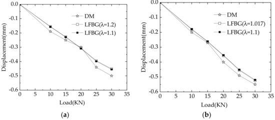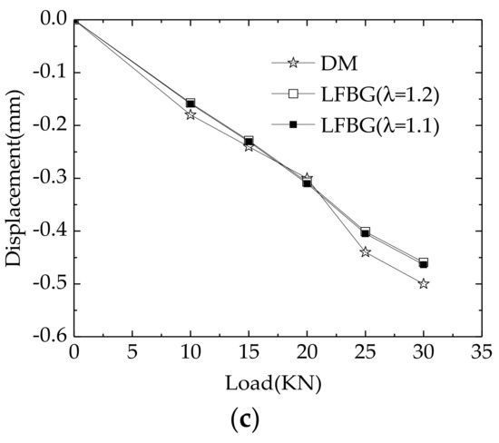 Table 4 gives the long-gage strain measurements from LFBG sensors placed on the surface of each element in different LSs. In each element, the measured strains from b1–b18 are positive, whereas the measured strains from u1–u18 are negative. This illustrates that the single-cell box girder mainly suffers an increasing bending moment with increasing loads. The bending moment brings tension to the lower part of the beam and compression to the upper part of the beam. Figure 9a–c gives the comparisons between the monitored displacements of point A, B, and C for different LSs as calculated from the strain measurements given in Table 4. Upward deformation is defined to be positive. At points A and C, the accurate value of λ is 1.2, while at point B it is 1.017. Table 5 shows the comparison of monitoring error percentages between the monitored displacements and the true displacements for each LS. The monitored displacements agree well with the true displacements. Most of the errors ranged from 6–8%, and the maximum monitoring error is only 11.0%. This agreement shows the applicability of the revised ICBM for deformation monitoring of a single-cell box girder based on LFBG sensors. In addition, the fact that the influence from different values of λ in deformation monitoring is almost lower than 1% shows that λ can be approximated by a constant value according to Table 1 to reduce the difficulty of determining this parameter while ensuring the good accuracy of monitored deformations. A comparison between monitoring errors from Table 3 and Table 5 shows that the precision of monitored deformations is dependent on the precision of the sensors rather than algorithm error. Thus, the algorithm error can be ignored in practical monitoring. In addition, this illustrates the importance of long-term monitoring precision and durability of long-gage sensors in practical deformation monitoring.