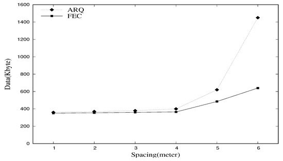The graph in Figure 1 compares the total amount of data that should be transferred in a network in order to enable the sink node to gather all 80 KB of sensory data from each leaf node. This is performed through both the ARQ and FEC methods [14]. A balanced binary tree topology with eight leaf nodes was adopted in this experiment. Each leaf node contained 10 KB of sensory data. In Figure 1, the x-axis represents the spacing between nodes and the y-axis refers to the total amount of data generated (including retransmission data) in the entire WSN in order to reach 80 KB of sink-collection data. The spacing represents the physical distance between nodes, but it can also be thought of as an error rate, because the greater the distance, the higher the error rate. The results verify that the difference is insignificant when the spacing value ranges from one to four. A significant difference is evident when the spacing value is five or higher. Furthermore, as the spacing value increases, the values in the ARQ method increase in the form of an exponential graph, whereas those of the FEC method increase in the form of a linear graph. When the spacing value is six, the two methods exhibit a difference of more than twice that. Note that the increased amount of generated data has a negative influence on not only the energy consumption, as it uses much energy for data transmission, but also on the network performance, such as the throughput, because there is a higher chance of channels becoming occupied and congested. The results in Figure 1 confirm that the FEC method is significantly more efficient than the ARQ method for WSN environments in which errors are prone to occur. Consequently, most WSNs choose the FEC method as their link-layer protocol.