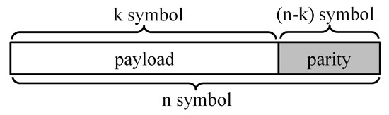 Figure 2 shows an RS block used in an RS coding scheme, which is representative among the various FEC methods [5]. Data to be transmitted are included in the payload, and a code is inserted into the parity part, which the receiver will use in order to restore errors. If the RS block consists of n symbols in total, with k symbols in the payload and symbols in the parity, then this is referred to as RS. It is well known that when an RS block of n symbols is transmitted, the maximum number of restorable symbols is [15,16,17].