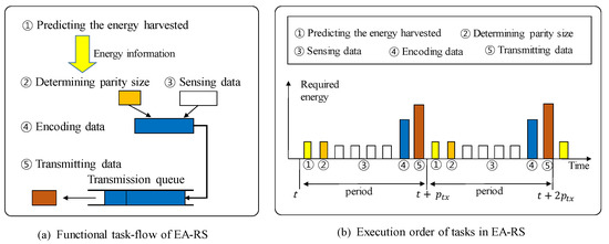 Figure 3 describes these operations in detail. Figure 3a describes the functional relationship between the operations described above, and Figure 3b shows the order in which the operations are performed in each period. By performing these operations, EA-RS can increase the data reliability of each node as much as possible within the available energy budget. Note that because the proposed method is based on predicting the energy consumptions of nodes, it can be applied more practically in time-based periodic applications, such as environmental monitoring applications, rather than event-based applications, which make it difficult to predict energy consumption.