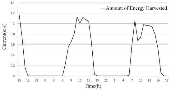 The performance evaluation was carried out using Solar-Castalia [20], which is a simulator specially designed for solar-powered WSNs. The harvested solar energy used in the simulation was based on real data [21] taken from actual solar-powered motes. The weather varied in a cycle with a length of one day, and sunny, cloudy or rainy days were randomly selected. Figure 5 shows sample data of energy harvested over two days. For the moving average shown in Equation (1), the value of was set to 0.5 due to the characteristics of solar energy as explained in Section 3.2.1, and the update period was 1 h. The payload of the RS block was composed of 32 symbols, and the size of each symbol was 8 bits. That is, the payload size of the RS block was 256 bits. The sensing rate of each node was 256 bits per round. In addition, the nodes were randomly arranged and experimented with on various network sizes and error environments by varying the field size, number of nodes and error rate. Details of the experimental conditions can be found in Table 3.