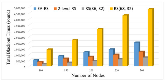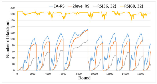 Figure 6 and Figure 7 present the results related to the blackout time. First, Figure 6 shows the number of blackout nodes over time for a total of 200 nodes with 0.15 BER (bit error rate). As can be seen in this figure, RS(68, 32) exhibits the largest number of blackout nodes during the entire time. This is because RS(68, 32) uses much energy to achieve the high error correction rate. On the contrary, RS(36, 32) has the lowest number of blackout nodes, which means that this scheme spends the lowest amount of energy on error correction. The two-level RS scheme and EA-RS yield similar results, which are considerably lower than RS(68, 32). This is because both schemes determine the error-correction rate dynamically by considering the energy state of a node.
