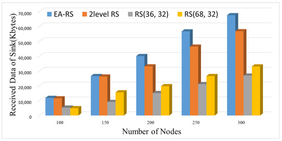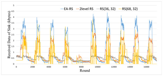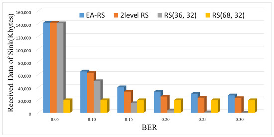Meanwhile, as shown in Figure 10, the three schemes of EA-RS, two-level RS and RS(36, 32) exhibit similarly high collection results when the BER is 0.05. This is because there is less need to recover data owing to the low BER. However, as the BER increases, the amount of collected data decreases. In particular, in the case of RS(36, 32), the amount of data collected at the sink is almost zero when the BER is 0.25 or greater.