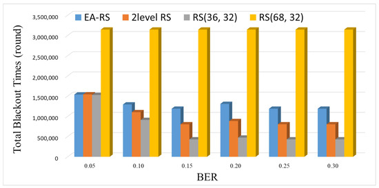 EA-RS exhibits the strongest performance, even when the channel state deteriorates, because it finely and adaptively controls the error correction rate. When comparing EA-RS to two-level RS, we can see that EA-RS achieves a slightly higher (inferior) blackout time, as shown in Figure 11. However, this result does not mean that EA-RS does not perform better than two-level RS, but rather, it means that EA-RS conducts more aggressive control of the data recovery rate, which can lead to a large amount of data transmission. This can be confirmed by the fact that the data collection rate of EA-RS is the highest in all error environments in Figure 10. In other words, the EA-RS scheme can further improve the overall amount of data collection by adjusting the parity bits more finely than the previous two-level RS scheme.