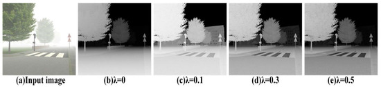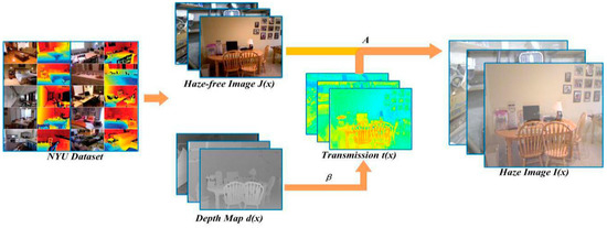 According to the degradation model, we randomly selected 500 haze-free images and their true depth maps from the NYU dataset to generate the corresponding haze images and transmission to be used as training samples. The formation of haze images is shown in Figure 2.