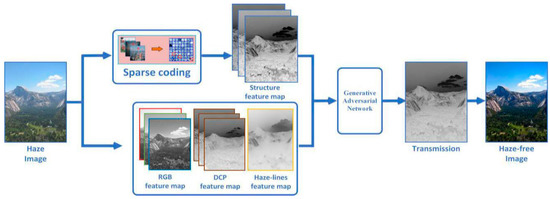 In Section 3, we explain the framework of our algorithm in detail. Based on sparse coding and feature learning, we present an efficient method for estimating the scene transmission of a haze image. Figure 3 shows the flow of our method, which consists of three parts: estimating the color feature maps of haze images through different priors and assumptions, extracting the structure features of haze images through sparse coding, and estimating the scene transmission through generative adversarial networks based on the extracted color and structure features.