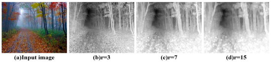 where Ω(x) denotes the local patches centered on x, of which the size is r × r. Ic(x) represents the components of haze image I(x) under the color channel C. Pr(x) denotes the DCP color feature map, which denotes the dark primary color features of local patches of the size of r × r and is used to estimate the scene transmission t(x). Since r is directly related to the estimation of the transmission t(x), we adopt multiscale dark primary color features to estimate the transmission t(x). Different scales of dark primary color features can reflect more information of the scene transmission t(x). Different scales of the DCP color feature maps Pr(x) are shown in Figure 4. It is apparent that the DCP color feature maps approximately reflect the distribution of haze in the image. The brighter the area in the image, the higher the haze density is. At the same time, r has an important influence on the shape of DCP color feature maps.