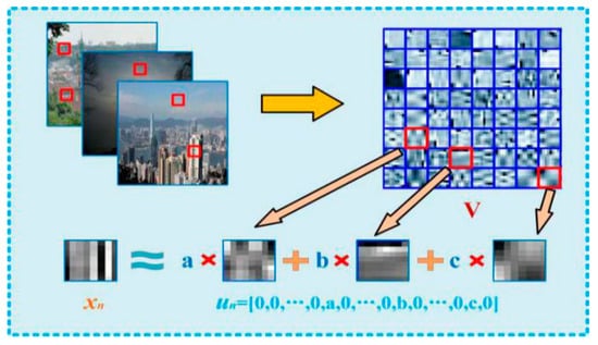 The sparse coding of natural images and the process of dictionary training are shown in Figure 5. V represents the visual dictionary, xn represents a local patch of the image, and un represents the sparse coefficients that correspond to xn. It is apparent that xn is represented as linear combinations of different atoms of dictionaries V. The process of sparse coding is expressed as follows: