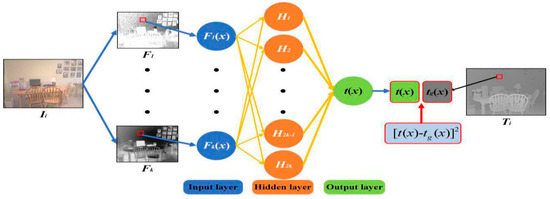 The generative network model and its training process for the estimation of scene transmission is shown in Figure 8. The network consists of an input layer, a hidden layer and an output layer. The number of neurons in the input layer is equal to the number of feature maps. There are twice as many neurons in the hidden layer as in the input layer, and there is only one neuron in the output layer, which represents the generative transmission tg(x).