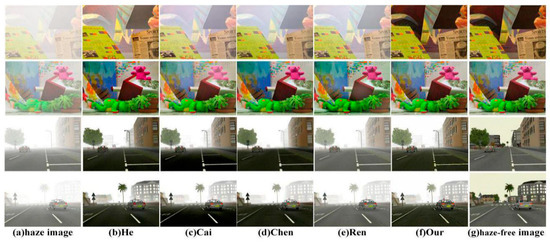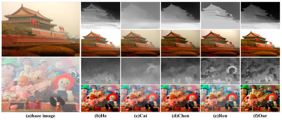 The comparison of the transmission is shown in Figure 10. In the first row of Figure 10, it is apparent that the edges of the transmission estimated by using our method are clear and hierarchical. In contrast, the transmissions estimated by using the methods of Cai [17], Chen [18] and Ren [19] show detail loss. For example, the mounds in the bottom-right corners of the images disappeared. As a result, the haze-free images restored by using the three methods have a problem associated with edge blurring in the second row of Figure 10. Although the transmission estimated by using the method of He [6] is full of details, it is too light, so the bottom of the restored image shows color distortion. For the third row of Figure 10, the transmission estimated by using our method has more detail information than the other methods. The other four methods show loss of detail loss. Additionally, our experimental results are clear in detail and natural in color.