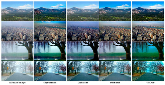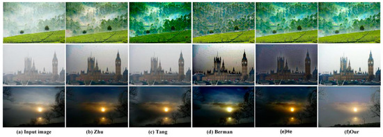 Next, we compared experimental results obtained from color priors, such as those presented in He [6], Zhu [8], Tang [10], and Berman [9]. As displayed in Figure 12, we chose natural images with thick fog, a large sky area and low brightness for experimental comparison. As shown in Figure 12b, the image restored using the method of Zhu [8] is darker and is not completely dehazed. The images restored using the method of Tang [10] have halo effects. In addition, the color of the image is too saturated. Finally, the images restored using the method of Berman [9] show obvious color distortion. In addition, the sun in Figure 12d is enlarged. Besides, it should be noted that the method of He [6] performs better for testing most images, but when it comes to the images with a large sky area, the retored results will have serious color distortion. As opposed to the four methods, the color using our method is closer to that of the input image. For example, the lawn in the last image restored using our method is green. Not only does our method achieve complete dehazing, it effectively avoids halo effects and color distortion.
