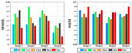 In addition, the minimum mean square error (MMSE) and structural similarity index (SSIM) are introduced to further illustrate the advantages and disadvantages of each method [24,25], which can help us comprehensively compare the difference among the restored images. As shown in Figure 14, the experimental results using the methods of Cai [17], Chen [18] and Ren [19] in Figure 13 have higher MMSE, indicating that they do not completely achieve dehazing. Meanwhile, although the experimental results using the method of He [6] have lower MMSE, the SSIM are also lower. In contrast, the MMSE of our method is low, indicating that the details of the restored image are clear. At the same time, the SSIM of our method is the highest among all results. In conclusion, the reliability of our method is further verified by quantitative analysis.