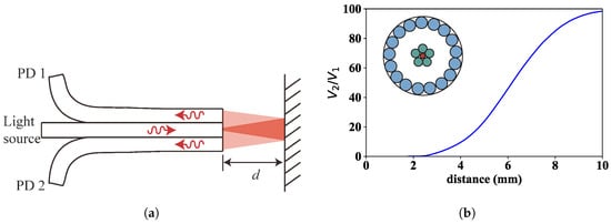 The schematic diagram of the sensor’s operation is shown in Figure 1a. The fibre bundle is the principal element of the system. To avoid modal noise at the output [], a central single-mode fibre is used as transmitting fibre of red laser light (wavelength of light: 660 nm), which after exiting the fibre bundle and being reflected by the target object located at a distance d from the fibre bundle tip, is partially gathered by two concentric rings of multimode optical fibres arranged around the central transmitting fibre; the inner ring consists of 5 optical fibres (fibre bunch 1; core diameters of 200 µm and Numerical Aperture (NA) of 0.2), whereas the outer ring consists of 17 optical fibres (fibre bunch 2; core diameters of 300 µm and NA of 0.2). The light collected by fibre bunches 1 and 2 is measured as a voltage level at photodetectors 1 and 2, respectively ( and ). If we plot the ratio of to as a function of distance d, we get the characteristic calibration curve shown in Figure 1b. The reason of using two photodetectors is aimed at minimizing the undesirable effects caused by intensity fluctuations in the light source and reflectivity variations on the target surface. As both voltage signals contain the same disturbance, the ratio gets rid of it and therefore becomes a pure function of the distance to the illuminated target surface d [,,].