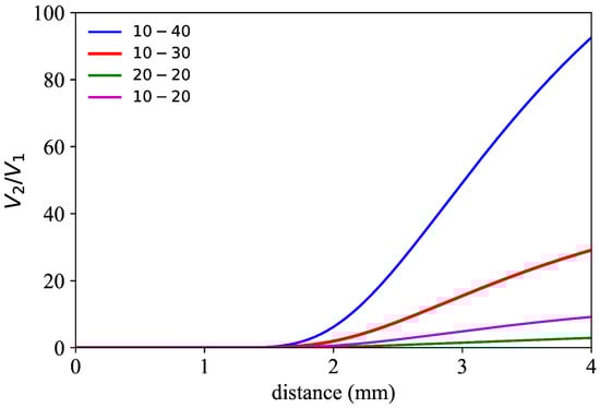 It is worth mentioning the great similarity between both curves in the distance range from 2 to 4 mm with very small differences between them, and with a clear linear increase of the rate of the voltage quotient with distance. The best linear fit (shown in the inset of Figure 3c) to the experimental data has a Pearson’s correlation of 0.997 in the distance range from 2.8 mm to 4 mm with a sensitivity slope of 61.73 mm−1. Within this distance range of interest, Table 1 shows, for different values of ranging between 30 and 100, the difference between the experimentally measured distance value and the corresponding value obtained from the simulation. The result is given as a percentage of the corresponding experimental value. The discrepancy between experiment and simulation never exceeds 1.5% (at ). It is also interesting to draw attention to the shift to lower distance values occurring in the front slope when moving from an object with specular reflection (target presented in Figure 1) to another one with diffuse reflection (blade shown in Figure 3). This can be easily understood with simple geometric and ray tracing models [].