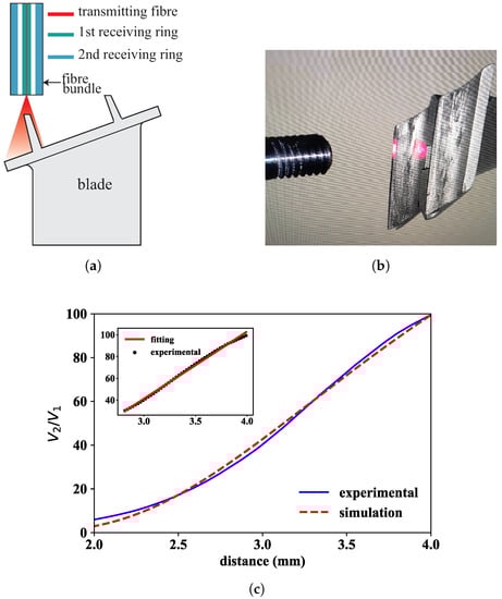 It is important to point out that, in the laboratory calibration tests, the transmitting fibre did not face the flat platform of the blade—as would be desirable to maximize the amount of reflected light gathered back by the bundle—but the very narrow sealing lands of the blade (around 0.7 mm in width) to simulate the real turbine configuration that the sensor head met when installed in the turbine rig. Figure 3b shows a close-up picture of the sensor head during the calibration process. Please note that even perfectly facing the transmitting fibre to the narrow sealing lands yielded a very low reflected signal that required setting the optical power to maximum value, in this case 50 mW. Therefore, the setting of 50 mW laser power and 10–40 gain configuration of the photodetectors always resulted in light intensity levels at each of the photodetectors below the saturation value, and the created voltage values spanned over the full voltage scale (0–5 V), ensuring a good use of the 16-bit resolution of the A/D converter. The large working distance set by the front slope of the fibre bundle also contributed to the low coupling efficiency of reflected light into the fibre bundle. Both simulated and measured calibration curves are shown in Figure 3c.
