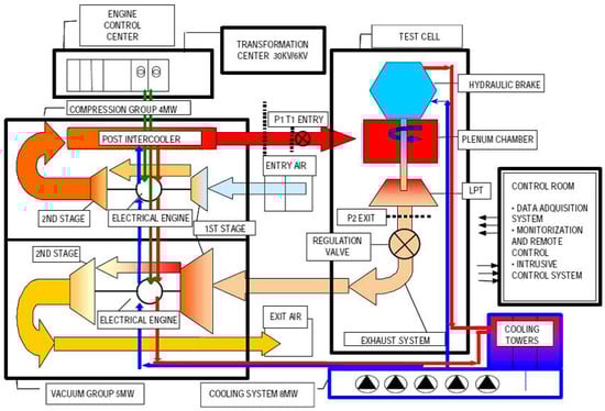 The supply and exit air conditions in the test section are achieved by two centrifugal compressor and vacuum groups, which are, respectively, run by electrical motors of 3.7 MW and 5.0 MW. Two vacuum pumps are used to achieve altitude conditions of sub-atmospheric pressure down to 12.5 kPa. A two-stage compressor group is used to control the pressure ratio and flow temperature and thus the Mach number of the flow within the circuit. The top mass flow rate achievable is 18 kg/s, with a maximum supply pressure up to 450 kPa, and a temperature regulation from atmospheric up to 450 K. Prior to entering the turbine, the air flows through a settling chamber that removes any swirl and axial velocity non-uniformity. The turbine power is transmitted by a single shaft (up to 7800 rpm) to a dynamometer. The test section has a section of 1 m. A schematic diagram of the facility is shown in Figure 4.