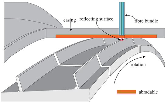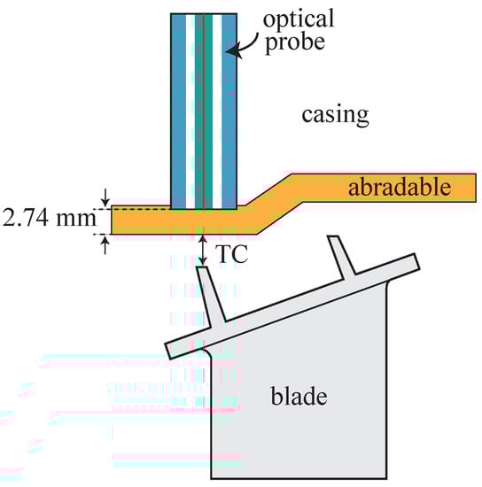 Figure 5 shows a schematic representation of the final arrangement of the bundle embedded in the casing of the turbine. The optical probe was attached to a micrometer-driven adapter that was inserted in a radial hole of the casing and fixed to it with four screws. The micrometer allowed to set a certain distance—3.2 mm in this particular case—between the probe tip and the sealing lands of one of the blades to set the operation point at the middle of the linear region shown in Figure 3c. For this particular configuration, the optical probe tip resulted to be within the abradable layer. The abradable is a soft protective wear material that is mounted on the casing wall aligned with the blades to create a good sealing, and avoid gas leakage and improve combustion efficiency. As TC values are commonly referenced to the abradable coating, below, we consider this case. Therefore, according to turbine design blueprints, the TC is obtained subtracting 2.74 mm to the actual sensor measurement (distance from probe tip to reflecting surface):