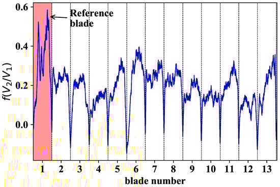 Typical signal response after applying the corresponding calibration curve. The blade highlighted in red refers to the blade with a higher reflection pattern. The dashed vertical lines correspond to local minima defining the limit between adjacent blades.