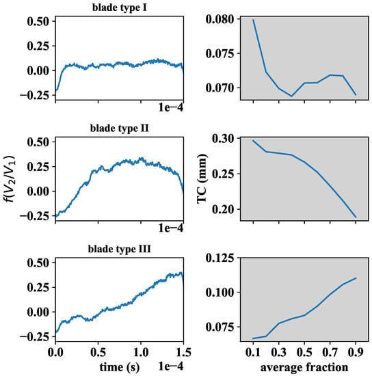 (Left) Types of blade signals found in the 92 blade turbine rig after applying the calibration curve; and (Right) evolution of TC definition with the selected fraction of blade data for each blade type.