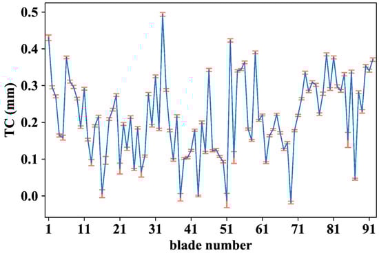 TC values of each blade at 4258 rpm with error bars that account for the TC standard deviation over 1100 revolutions.