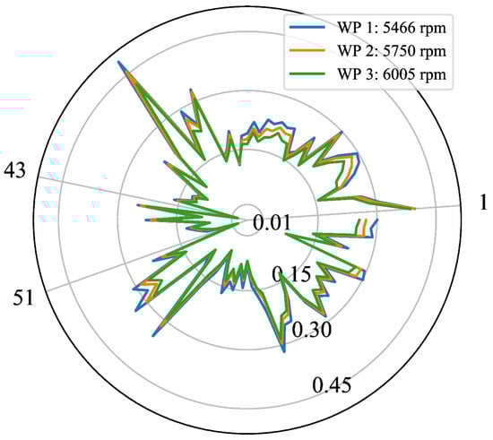 The TC maps of all blades corresponding to three different WPs in ascending order of rpm are shown in the polar plot of Figure 10. Each TC map is represented as a curve of a particular color. On the other hand, each blade is expressed as a single point where the polar angle defines the blade number i— for —and the corresponding TC value is given by the radial distance. Observe that TC values of individual blades decrease as engine rotational speed increases, a fact that can be attributed to the centrifugal and thermal loads acting on static and rotating components of the turbine. It is also interesting to point out that blades 43 and 51 still continue to be decisive in determining the TC values of the turbine, in the same way as in the case of the WP at 4258 rpm shown in Figure 9. If we define the turbine TC as the minimum blade TC among all blades, as expected, the TC decreases from 0.002 mm to −0.005 mm when going from WP 1 (5466 rpm) to WP 3 (6005 rpm).