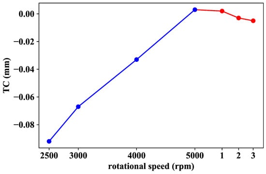 This observation brings us to conclude that temperature ramping occurring in the wind tunnel before the first operation point is reached might be associated with the observed TC increase with rotational speed. In addition, the blade-case rubbing experienced during the whole warming-up process (negative TC values of blue data points in Figure 11) may be justified if we consider that the centrifugal load on the blades applies from the first moment before the casing starts to expand. However, once the operation temperature has been reached and the casing has expanded to its equilibrium value (first red data point in Figure 11: WP 1 → 5466 rpm), the clearance starts to decrease with rotational speed as expected.