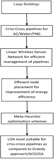 Water, gas and oil pipelines cross states, countries and sometimes also continents and their length varies between a few kilometers to thousands of kilometers. Modern large smart buildings also use various types of pipelines such as AC, water and Piped Natural Gas (PNG) pipelines, which may cross each other. The length of such pipelines varies from a few hundred meters to a few kilometers. Moreover, the network of pipelines in a smart building is a combination of various pipelines, which cross each other at different points. The number of skyscrapers is bound to increase due to the scarcity of premium space and increasing populations. Moreover, buildings are getting smarter day by day. The reduced cost of sensors has made it possible to extensively use sensors for monitoring and safety purposes in smart buildings. Recently, Kumar et al. [14] published a survey to describe the techniques currently being used to improve the performance of sensor-based systems used for applications in intelligent buildings such as improving air quality, lighting, heating/cooling, ventilation, power management, water management, and cooking gas management.