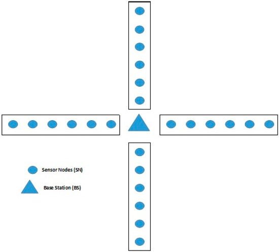 In recent years, researchers have used evolutionary approaches such as Genetic Algorithm and Ant Colony Optimization (ACO) [27] for solving the deployment problem in LWSNs. In [27], the authors claimed that evolutionary algorithms can solve the node deployment problem in LWSNs effectively and efficiently. Recently, a new evolutionary approach namely Lion Optimization Algorithm [28] has been proposed which has been proven better than the other existing techniques and has been used in several areas. The Ant Colony Optimization is more suitable for a single straight pipeline because the ants move in a straight-line one behind the other in one direction only. However, the problem considered in the paper includes multiple pipelines, and the data is to be sent to the Base Station (BS) from multiple directions by the sensor nodes as shown in Figure 2. The group hunters such as lions attack the prey from multiple directions, and the Lion Optimization Algorithm tries to use this characteristic of lions to find the optimal solution of the problem being considered. This motivated us to use Lion Optimization Algorithm (LOA) for optimal node placement and Base Station (BS) in LWSN including multiple pipelines. To the best of our knowledge, LOA has not been used by any other researchers for this purpose.