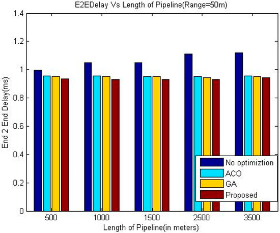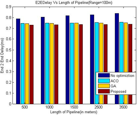 It is evident from the simulation results that the delay in the greedy approach is increasing with the length of the pipeline whereas this trend is not consistent in the case of the other three meta-heuristic techniques. A possible reason for this phenomenon may be that the number of nodes also increases when the length of the pipeline is increased. In the case of meta-heuristic techniques, when the number of nodes in the system is higher, the meta-heuristic techniques can be applied more efficiently which may offset the effect of increased length of the pipeline on the end to end delay in some cases.