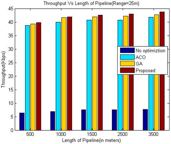 The proposed algorithm outperforms greedy approach as far as throughput is concerned. Additionally, the throughput of our technique is slightly better than the other two considered techniques namely GA and ACO. In the presented approach, the location has been optimized based upon drop ratio and delay whereas the authors in [24] try to optimize the location based upon delay only. This factor is the reason for the better throughput of the proposed algorithm. It is evident from the simulation results that the throughput increases upon increasing the communication range of sensor nodes for all the algorithms.