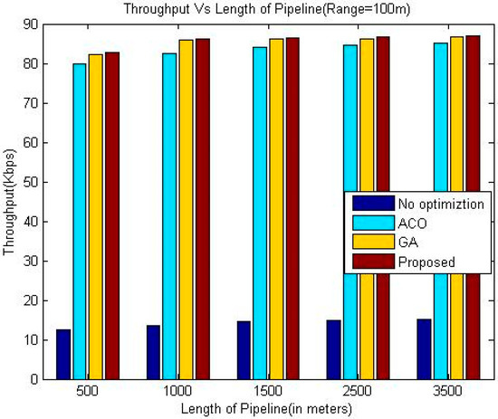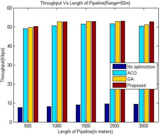 The algorithm described in the previous section has been implemented using MATLAB. The proposed approach has been compared with different existing techniques such as ACO, GA and Greedy Approach. The parameters considered for comparison are delay, throughput and the normalized lifetime. The length of pipeline has been varied from 500 m to 3500 m. The initial energy of each sensor node has been considered to be 1 joule, the energy consumed in communication is directly proportional to communication distance. The parameters considered are similar to the closest work [16]. The simulation experiments have been repeated for sensor node communication range varying from 25 m to 100 m.The parameters considered have been summarized in the Table 1.