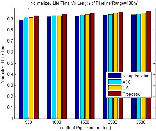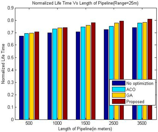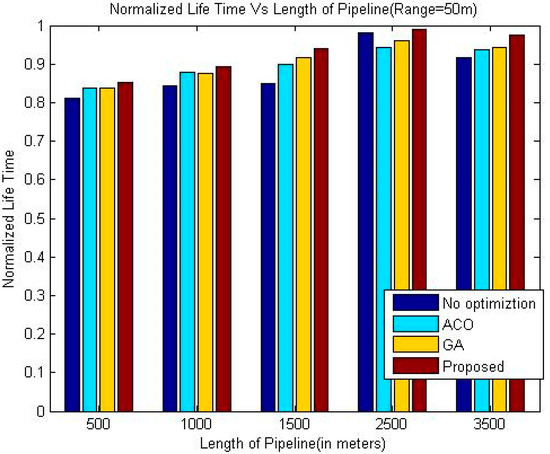 The normalized lifetime of the proposed techniques signifies that lifetime of the network in each scenario with different pipeline length is better than the other techniques under consideration. The reason behind this phenomenon is like the nature of pipelines inside a building; LOA also considers crossing paths for optimization. The performance is significantly better than all other three techniques under consideration when the length of the pipeline is 1500 m, which makes it suitable for pipelines inside a large building.