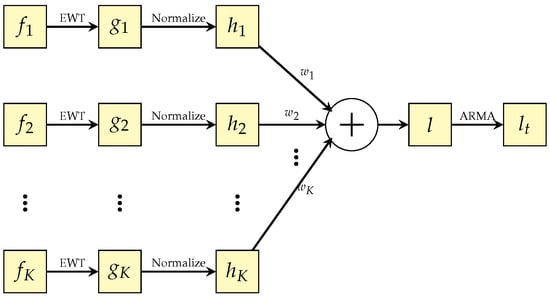 In engineering and technical fields, there is a special class of signals that are captured from the same complicated system and have close or relaxed relationships among them. With the system running, each signal only reflects one side of the operational states—for example, temperature, humidity, pressure, etc. If we extract the significant modes of all measured signals, we can synthesize an indicator function, which can be applied to forecast the future operational states of the whole system. Prior to getting the reliable significant mode of each measured signal, the random noise or interference must be carefully reduced, i.e., the extracted significant modes are reliable. In order to achieve the above tasks, we propose a novel method that is based on EWT (empirical wavelet transform) and ARMA (autoregressive and moving average model). The block diagram of the approach is shown in Figure 1.
