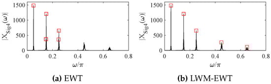 where is the k-th value in the amplitude vector . is the k-th value of the vector , to tune the k-th harmonic frequency. Hz, , . The sampling frequency Hz and sampling time s. The spectrum peaks obtained by the classical EWT and LWM-EWT [29] are shown in Figure 2.