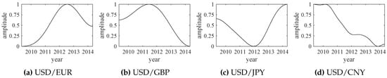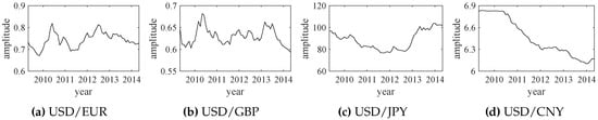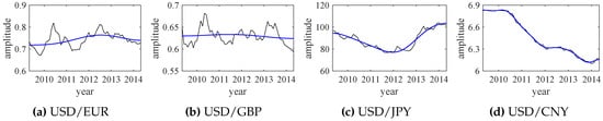 The trend forecast approach proposed in Section 2 can be easily extended to a variety of fields, including science, technology, engineering, society, finance, etc. Here, we use the exchange rate data to verify the effectiveness of the proposed method. The adopted exchange rate data of USD/EUR, USD/GBP, USD/JPY and USD/CN are shown in Figure 13.