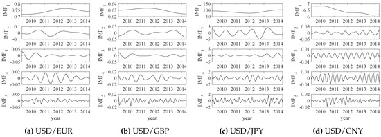 The empirical wavelet transform (EWT) results of those exchange rate data are shown in Figure 14. Similarly, the relative energy values of IMFs are calculated by (11) and all IMF components are selected as the significant modes. The extracted significant modes and their corresponding exchange rate data are shown in Figure 15. Each significant mode (IMF) can represent the overall changes of the original exchange rate data. Then, normalized significant modes are shown in Figure 16.