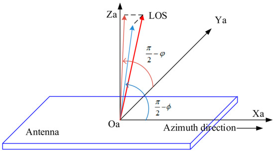 The squint angle and look angle represent the direction of the beam itself in space, but sometimes it needs to know the direction of the beam in the antenna coordinate system , i.e., the beam direction represented by the antenna beam azimuth and elevation angle, as shown in Figure 2. In the antenna coordinate system, points to the direction of the length of the antenna, points to the direction of the height of the antenna, and points to the direction of the normal of the antenna. The coordinates of the vector in the antenna coordinate system are: