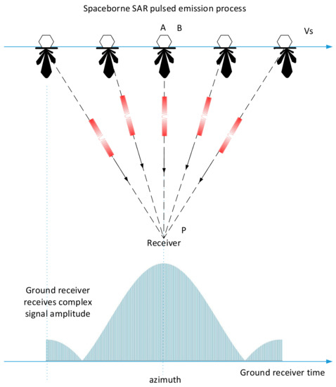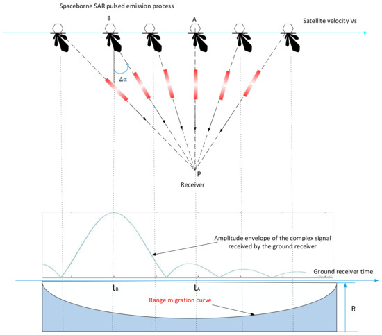 Assuming that the spaceborne SAR is orbiting, a ground receiver is placed near the center of the ground imaging area to receive the pulse signal transmitted by the spaceborne SAR. The signal is sampled and recorded at a certain frequency which meets the sampling theorem. We define the closest relative position of the spaceborne SAR and ground receiver as the position where the satellite is right over-the-top of the receiver (this moment is denoted as the satellite’s ceiling time). At this position, the connection line between the satellite and the ground receiver is approximately perpendicular to the satellite’s flight trajectory.