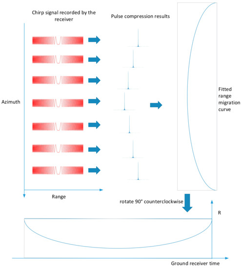 Since the ground receiver completely records the phase information of the pulse signal transmitted from the spaceborne SAR, the effect of range migration can be amplified by interpolation, which improves the accuracy of extraction. Figure 5 shows the process, and the process is as follows: