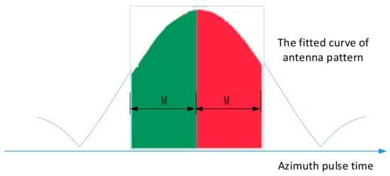 The pulse compression peak of the range migration curve obtained above corresponds to the amplitude envelope of the data received by the ground receiver, which also reflects the azimuth pattern of the antenna of the spaceborne SAR. Record the pulse azimuth position and pulse compression peak of the range migration curve, and obtain the azimuth pattern function , then construct the fitted function . Using the antenna main lobe symmetry property, we could obtain the abscissa of the antenna main lobe’s maximum value with the same method of obtaining .