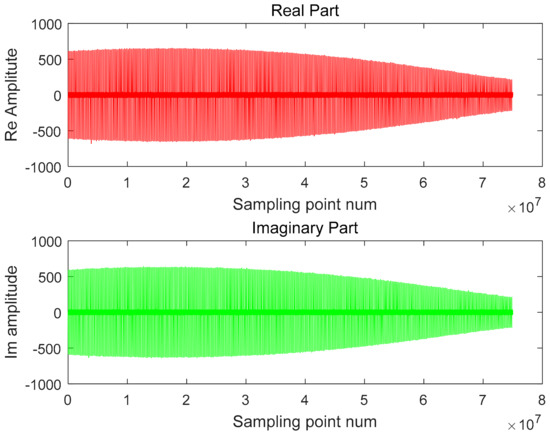 The H-polarized data recorded by the ground receiver are shown in Figure 7 below. The sampling rate of the receiver is 300 MHz. The recorded number of complete H-polarized transmit pulses is 349 and the length of time is about 0.25 s. It can be seen from the figure that the main lobe portion of the SAR antenna beam is received. The SAR azimuth emission pattern beamwidth and the ground receiver receiving pattern beamwidth data show that the latter is more than 72 times that of the former, so the modulation effect of the receiver pattern can be ignored in the receiver data processing.