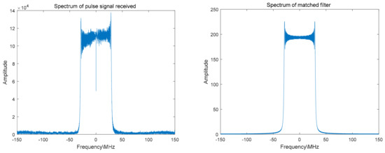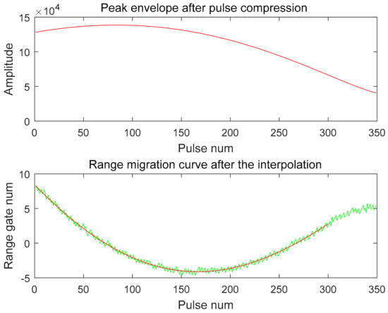 In order to improve the processing efficiency, the pulse signal data is first taken out from the complex sampling data, and the invalid noise data between pulses is eliminated; then, process the data as described in Section 3. Figure 8 shows the spectrum of one of the pulse signals and the spectrum of the matched filter. Figure 9 shows the extracted range migration curve and the pulse compression peak envelope.