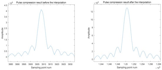Figure 11 shows the comparison of the pulse compression results before and after interpolation, and shows that only the peak value of the pulse compression can be accurately extracted after interpolation.